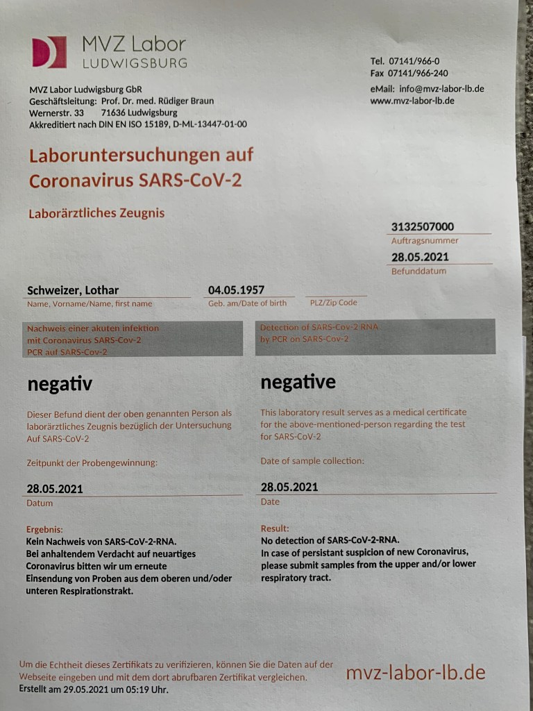 Jetzt geht´s los. Gestern PCR-Test beim Hausarzt, heute in aller Frühe das Negativergebnis vom Labor geladen und gedruckt. Nachher, gegen 15:30 Uhr, ab nach Freiburg. Fahrzeug ist schon gepackt und steht abfahrtbereit in Richtung Autobahn.