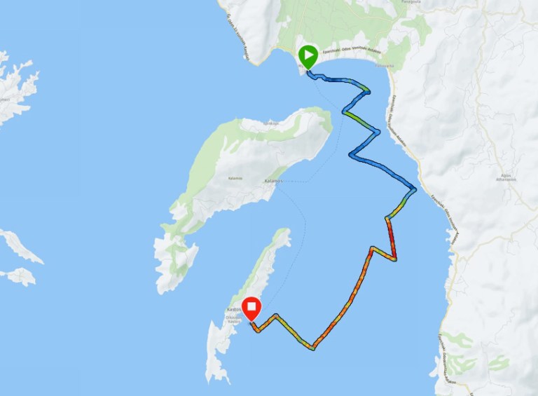 In der Enge zwischen den Inseln Kastos und Kalamos mussten wir noch kreuzen, kamen aber super gut voran und sind jetzt gemütlich im Hafencafe bei Frapeé und anderen kühlen Getränken. Hier noch unsere heutige Route: